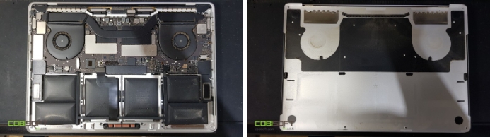 애플노트북 맥북프로배터리 교체 작업을 하기 위해서는 후면 커버 분리! 사진상 잘 표현이 안됐지만 배터리스웰링 증