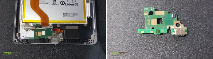 문제의 충전단자 부품은 미디어패드m5 하단에 위치하며 전문 장비로 자세히 살펴보니 c타입 충전단자 부품이 모듈 보