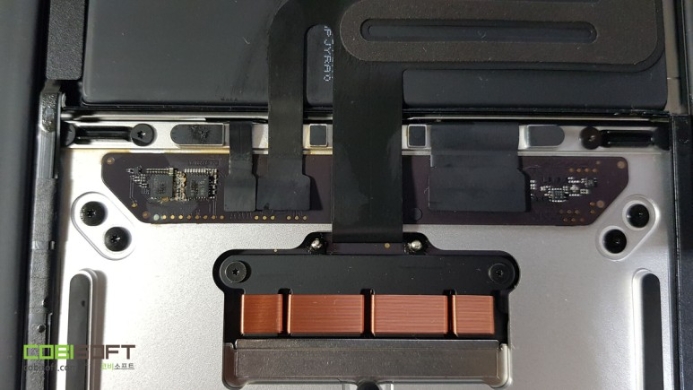 침수노트북 M1 맥북에어 13인치 작업 전 가장 눈에 띈 부분은 트랙패드 부품 쪽 인대 사진에 보이는 저 긴 콘드롤 보드