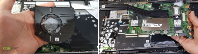게이밍노트북 라인이 아니라서 다소 쿨링 시스템이 부실해 보이며 보드 특성상 민감한 부품이라 분리하고 난 뒤 세심하