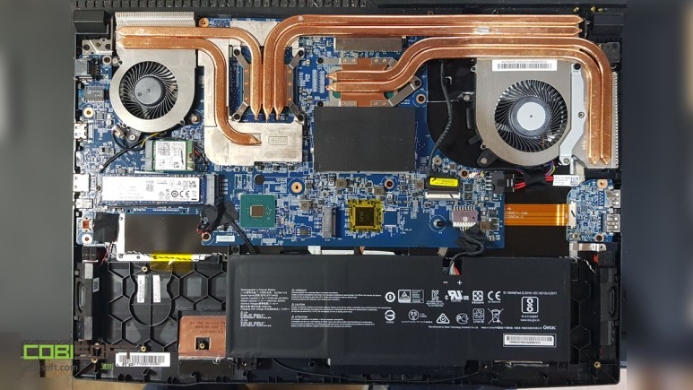 MSI GF76 노트북 내부! 게이밍노트북 라인답게 좌우로 펜이 있고 하단에 커다란 배터리 중앙에 메인보드가 배치된 아