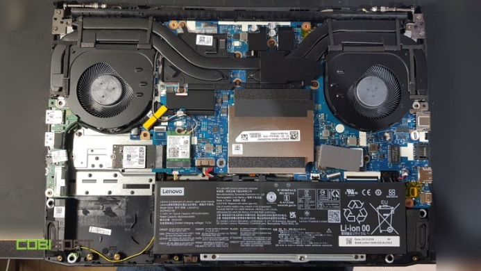 아이디어 패드 게이밍3 내부! 노트북 답게 하단에 큼직한 배터리가 보이며 그 위로 메인보드가 위치하는 전형적인 노트