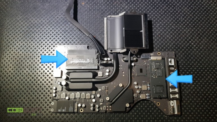 2017 아이맥 21.5 인치 메인보드 분리 완료! 화살표가 가리키는 부품들이 메모리, 애플 SSD 이며 두 부품 모두 분리