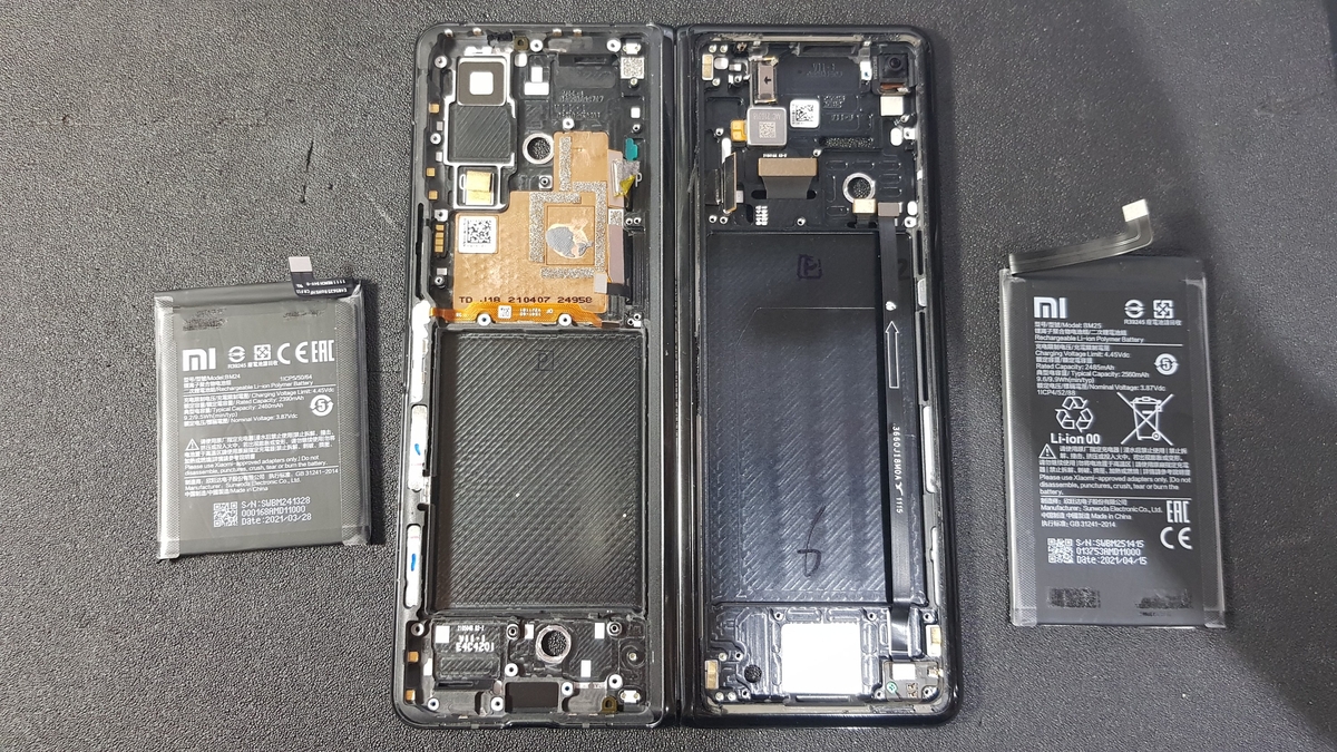 아까도 설명했지만 스마트폰 2대가 연결된듯한 비주얼이라 미 폴드 스마트폰 배터리 역시 좌우로 2개로 구성되었고 역시나 리튬이온 배터리라 잘못분리하면 배터리 폭발 또는 성능이 떨어지는 불량 배터리가 될 가능성이 있기에 상당히 조심 스럽게 분리해줘야됩니다.