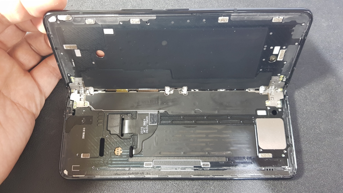 접히는 폴더블 스마트폰 특성상 좌우로 스마트폰 2대가 있다고 보는것이 타당하지만 사진 상 본체는 왼쪽, 서브가 오른쪽이며 각각 보드가 있기 때문에 메인보드 보호 및 안테나, 스피커 역활을 하는 프레임을 분리해야 메인보드 분리가 가능합니다.