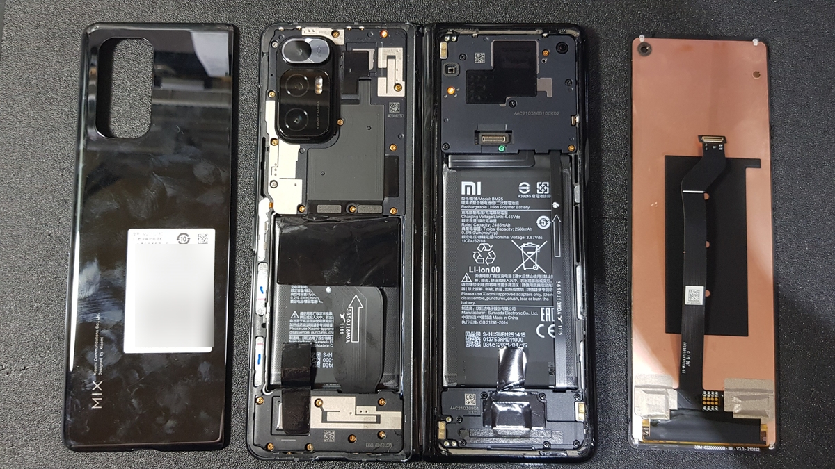 샤오미 미 믹스 폴드 메인보드 분리! 실질적으로 메인칩, 카메라, 충전단자가 연결되는 왼쪽이 메인이고 오른쪽 작은 보드는 외부 디스플레이와 왼쪽 메인보드를 연결해서 출력하는 역활을합니다.