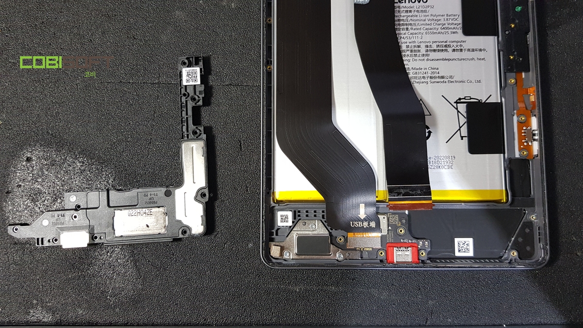 레노버 가성비 태블릿 P11 또는 샤오미신패드 태블릿과 달리 게이밍 라인이라 그런지 아주 큼지막한 베이퍼챔버 부품으로 보이는 구리판이 태블릿 절반을 덮고 있으며 문제의 충전단자는 사진상 우측 중앙에 위치합니다.