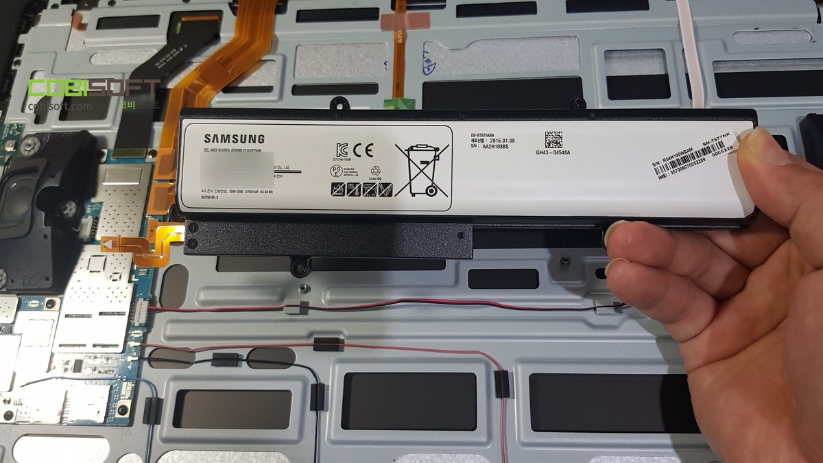 보통 태블릿 배터리 부품은 얇은 폴리머 방식이라면 갤럭시 뷰 태블릿 배터리 부품은 마치 노트북 배터리 처럼 투박하지만 큰 사이즈로 되어있고 현재는 충전이 안 되기 때문에 폐기하고 정상 배터리 부품으로 달아주면 끝!