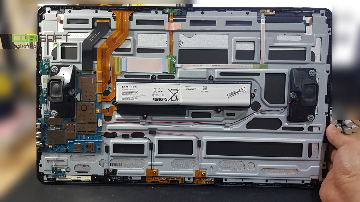 18인치 큰 사이즈 액정에 비해 갤럭시 뷰 18.5 태블릿 내부는 생각보다 심플한데 사진상 좌측에 메인보드, 중앙에 배터리, 좌우로 스피커가 있습니다.