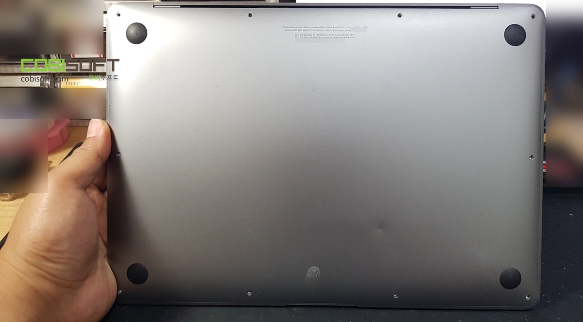 애플 노트북 맥북, 맥북에어, 맥북프로 등의 기기들은 대부분 후면 중앙에 모델명이 위치하는데 후면 커버 분리 전 모델명 한번 확인하고 후면 커버 분리!