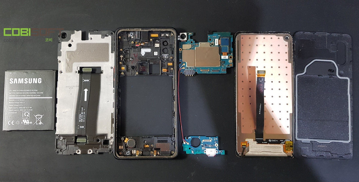 갤럭시 엑스커버 프로 러기드폰 액정, 프레임 교체를 하려면 사실상 모든 부품을 들어야 됐기에 모든 부품 완료 후 나열해 보니 위 사진과 같은 모습이며 새 프레임, 액정 부품 가지고 역순으로 조립해 주면 작업 끄읏!