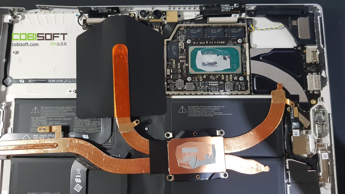 여타 해외직구 외산 태블릿, 국내 태블릿 pc 들은 모바일 칩을 사용하지만 MS 서피스프로 태블릿들은 인텔 CPU를 사용하므로 사실상 노트북으로 봐도 무방해서 서피스 내부를 보면 아주 큼직한 히트파이프가 적용됩니다.