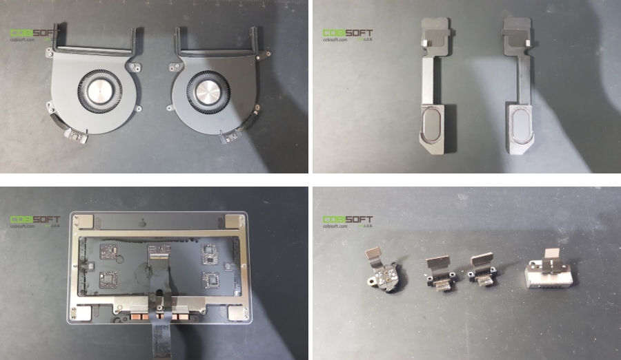 맥북프로 펜, 스피커, 트랙패드, 각종 단자 등을 분리한 모습이며 굵직한 부품은 모르겠지만 작은 부품도 상당히 많아 숙련된 작업자가 아니면 다시 완벽하게 재조립을 조금 까다롭습니다.