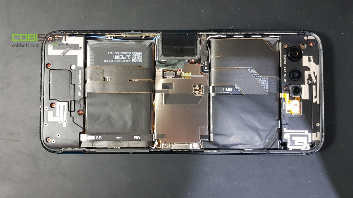 아무튼 이런 구조라서 로그폰 백커버 분리할 때는 RGB가 표시되는 부분을 조심해야 되고 메인보드와 연결된 케이블을 분리하고 백커버를 분리해 주야 됩니다.
