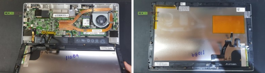 태블릿 나사 분리 후 액정 분리를 해줘야되는데...액정이 양면테이프로 고정되는 방식이 아닌 후크 형식으로 헤라를 통해 살살 들어주고 안쪽 보드랑 연결된 케이블을 분리해줘야 안전하게 액정분리가 됩니다.