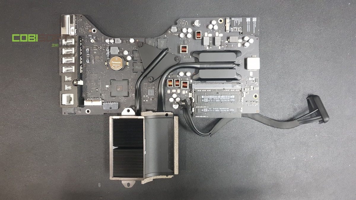 아이맥 27 인치 모델과 달리 아이맥 21.5 인치 모델은 메인보드 옆구리에 메모리가 달리는 디자인이라 대부분의 부품을 분리해 줘야 메인보드 분리가 가능합니다 ㅠㅠ