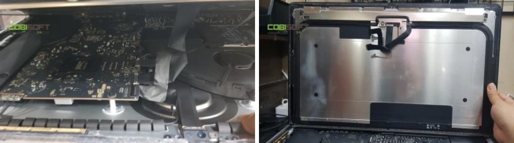 일체형컴퓨터 아이맥 디자인 구조상 마치 아이패드 처럼 전면 액정이 본체에 양면테이프로 붙어있으며 당연히 내부 보드와 연결된 케이블이 있으니 액정을 살짝 들어 케이블 분리 후 액정을 분리해야 안전하게 분리됩니다.