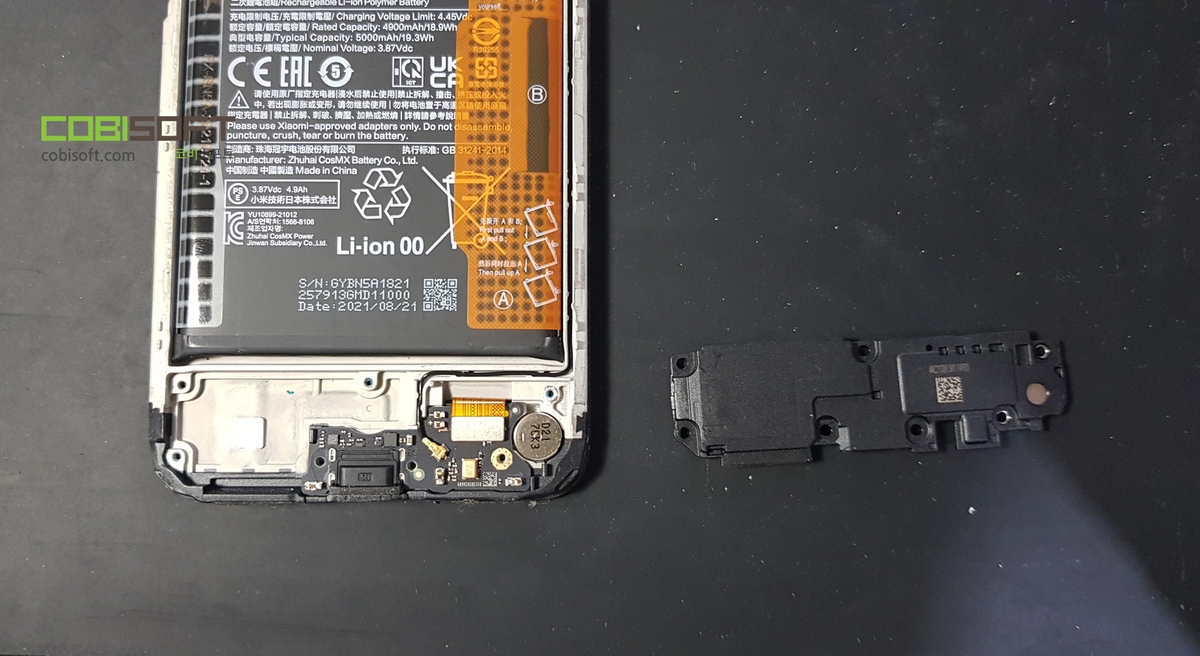 하단 프레임 부품은 스피커, 안테나 역할을 하며 그 안쪽에 홍미 10 충전단자 부품이 있고 충전단자 부품은 다시 액정과 연결되는 구조를 가지고 있으니 분리할 때 내부 부품들이 손상되지 않게 분리해 주면 됩니다.