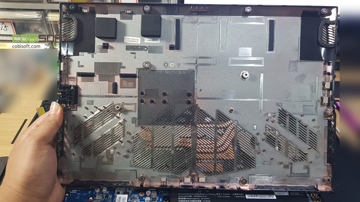 기가바이트 게이밍 노트북 액정교체 수리를 하기 위해 후면 커버 분리! 대체로 플라스틱 재질로 되어있고 방열을 위해 펜이 배치된 부분에 구멍이 숭숭 뚫려있답니다.