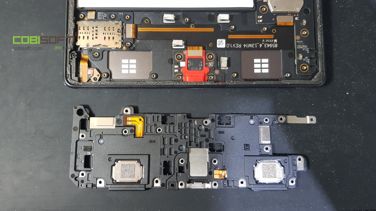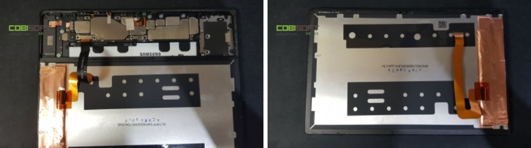 갤럭시 탭 A7 내부! 태블릿 답게 배터리 부품이 가장 큰 부피를 차지하며 사진상 배터리 위로 메인보드, 좌우로 스피커, 우측에 충전단자 부품이 있답니다.