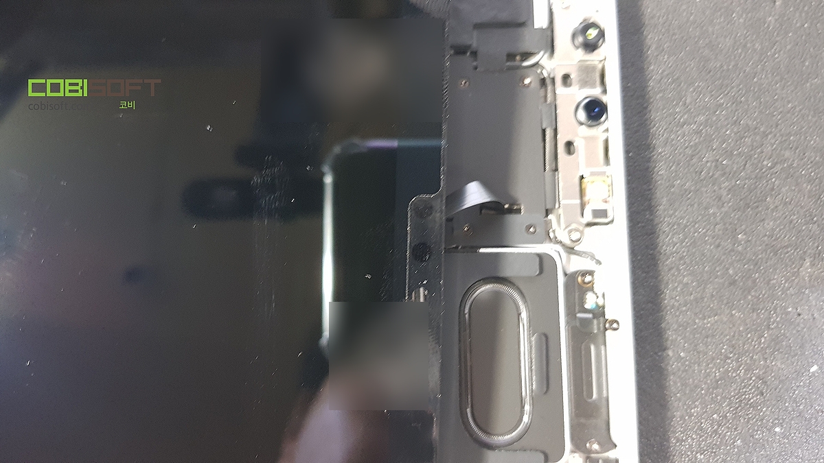 애플 아이패드프로 디자인 구조상 전면 액정 분리 작업을 해야 내부를 볼 수 있는데....페이스아이디, 조도센서 부품이 액정에 붙어있고 보드랑 연결되기에 액정 분리 전 필수로 센서를 먼저 분리해야됩니다.