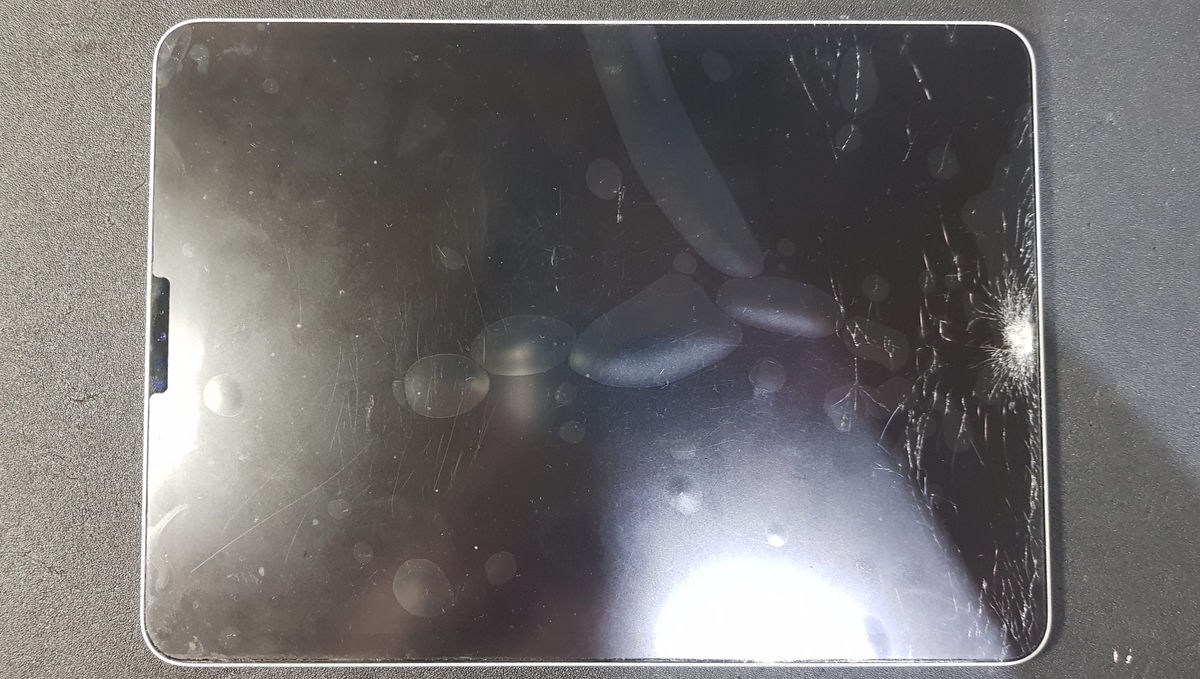 Apple Ipad Pro 11 A2228 태블릿 pc 상태는.. 사진으로 보면 우측 중앙, 똑바로 보면 하단 액정파손으로 인해 유리가루가 심하게 날려 정상적인 사용이 힘들기에 아이패드 수리를 하고자 천안 코비소프트를 방문해 주셨습니다.