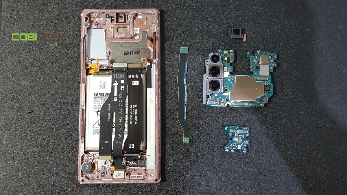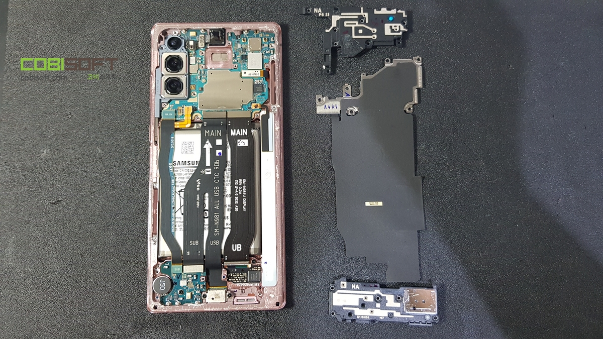 갤럭시 노트20 메인보드 분리! 보드를 분리하면 부가적으로 후면 카메라, 전면 카메라 분리가 가능하며 보드, 백커버, 하단 서브 보드, 총 3부분에 마이크가 있기에 모두 분리해서 마이크를 제거해야 됩니다.