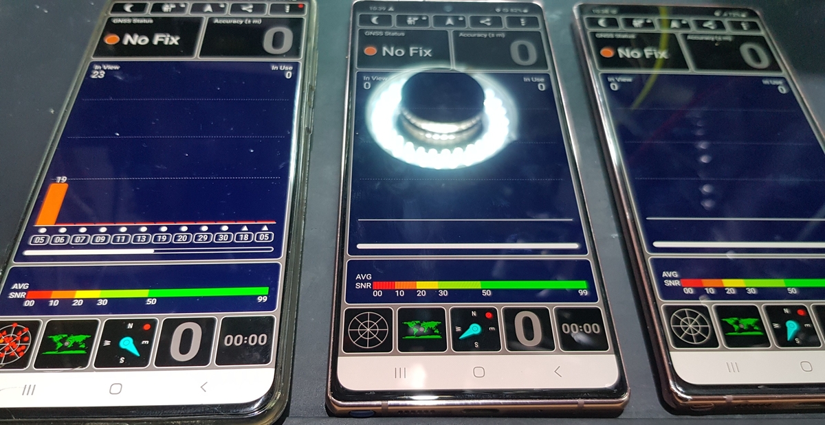 GPS 테스트..왼쪽 첫 번째 스마트폰은 회산폰이고 우측 2개 폰은 작업된 노트20 스마트폰으로 회사폰은 GPS 기능이 정상 작동하지만 우측 2개 폰은 전혀 잡히지 않는 것이 확인되네요 ^^