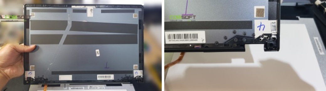 GE66 파손 프레임 분리! 파손 정도가 심하기 때문에 보수 불가! 우측 사진을 보면 힌지 고정부가 완전히 뜯겨진 상태라서 바로 폐기하고 정상 프레임 부품으로 교체하고 닫으면 됩니다.