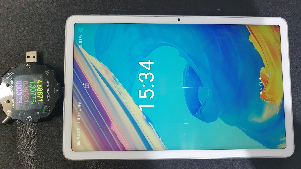 고장 난 태블릿 충전단자 교체 수리 후 조립을 했으며 다행히 정상 부팅되고 있고 기능상 문제도 없어 보이며 교체된 충전단자가 제 역할을 하는지 충전속도, 방전속도, 전압 등을 꼼꼼하게 검수, 테스트를 하고 작업을 마무리했습니다.