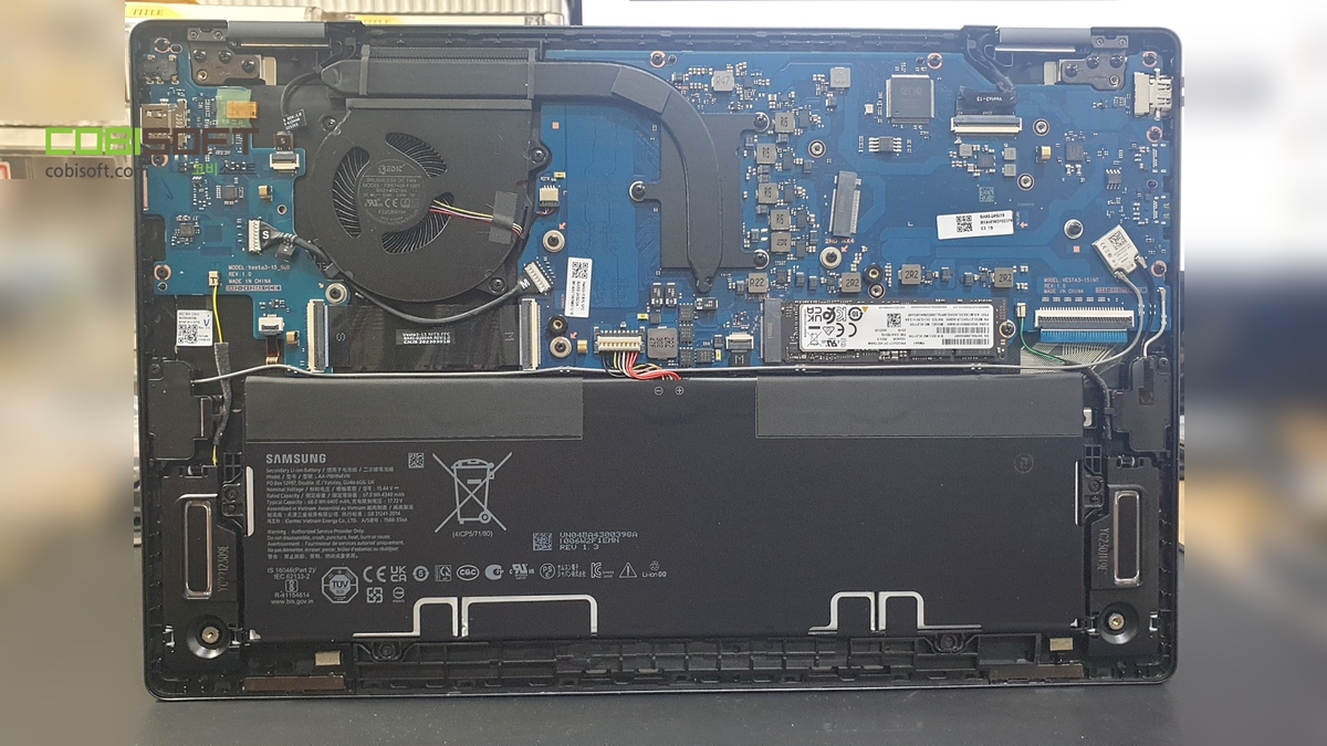 게이밍 노트북 라인은 아니고 업무용 노트북, 사무용 노트북 라인쯤? 이라 다소 내부가 간소한대 살펴보면 하단에 배터리, 좌우로 스피커, 상단에 메인보드, 좌측에 i/O 보드가 있답니다.