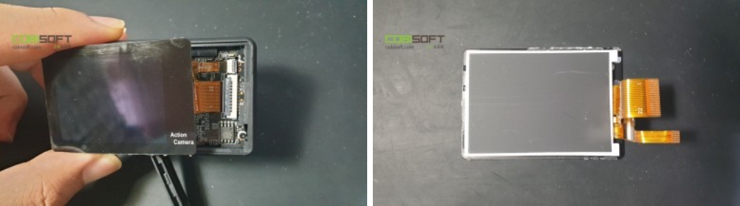 터치가 되지 않는 액션캠 들은 LCD 쪽 분리할 때 보호 유리 따로, 패널 따로 분리가 됐는데 터치가 되는 모델이라 그런지 UPRO 액션캠 액정 부품은 한 번에 분리되지만 구조상 분리할 때는 상당히 조심해야 되며 안쪽에 케이블 있어 힘으로 뜯으면 파손되는 경우가 있으니 주의!