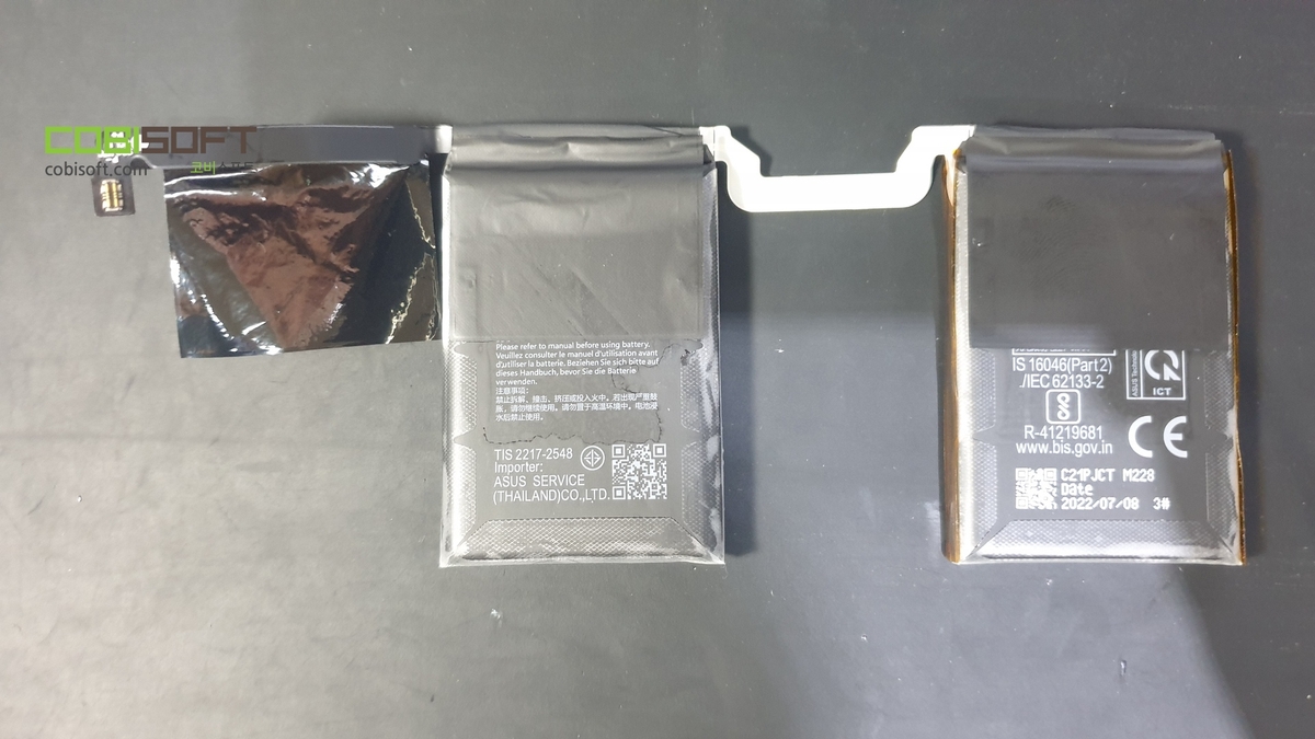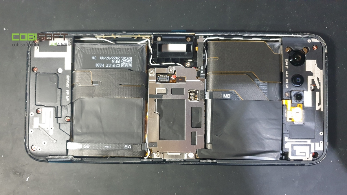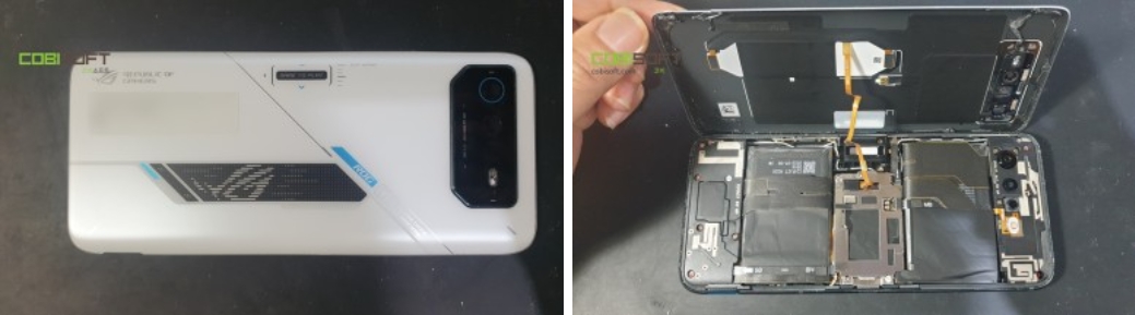ROG 6 게임폰 백커버 분리! ASUS는 게이밍에 진심이라 화려한 RGB를 스마트폰에도 적용해서 백커버에 ASUS 시그니처 로고가 번쩍이기에 분리할 때 이 로고에 전기를 공급하는 케이블을 먼저 제거하고 백커버를 분리해야 안전한 작업이 가능합니다.