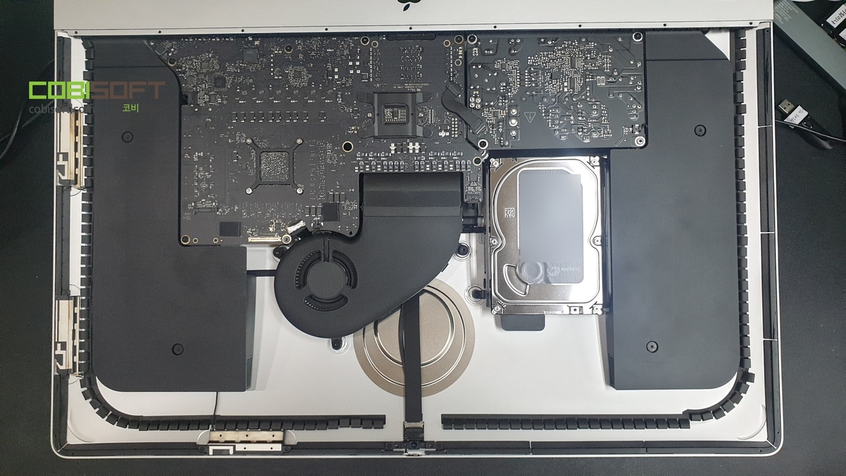 아이맥 27 내부! 살펴보면 좌우 스피커, 중앙에 팬, 하드, 메인보드, 파워가 몰려있는 배치이며 의뢰 모델은 퓨전드라이브 형식이라 현제 육안으로 보이는 3.5 HDD 하드와 내부 메인보드에 붙어있는 애플 SSD 부품을 모두 분리하고 SSD 업그레이드를 해줘야 됩니다.