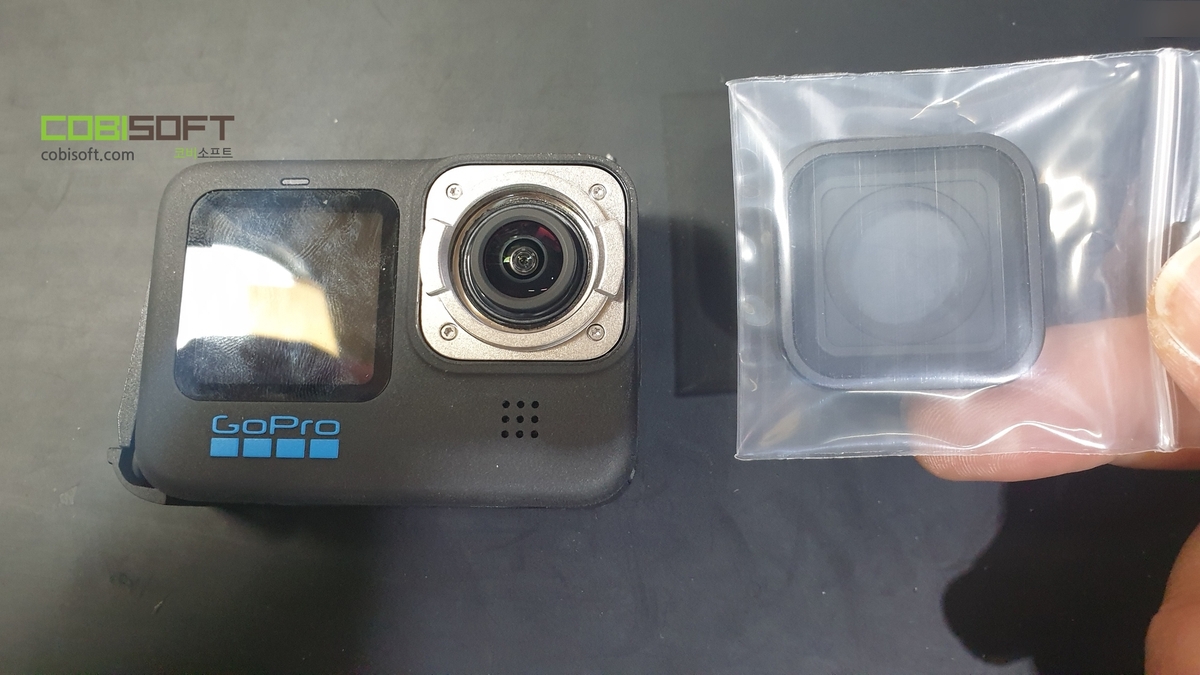 고프로 렌즈 보호 커버 분리! 고프로 분해 과정 중 가장 쉽게 분리되는 부품으로 잼 뚜껑 열듯이 잡고 돌려주면 쉽게 분리가 되며 안쪽 유리에 먼지가 들어가지 않도록 작은 지퍼백에 넣어서 보관해 주면 됩니다.