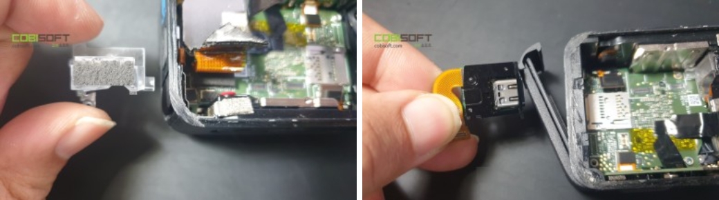 왼쪽 사진은 표시등 LED 및 커넥터를 잡아주는 부품이고 오른쪽 사진은 C타입 충전단자 부품인데 메인보드와 아주 밀접하게 고정, 부착된 부품들이라 보드가 손상되지 않게 세심한 손길로 분리해 주면 됩니다.
