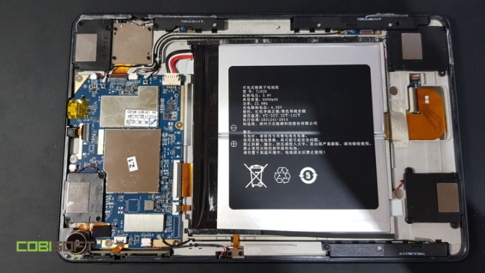 태블릿 모델답게 내부가 약간 빈약해 보이며 사진상 왼쪽에 메인보드, 중앙에 배터리, 각 코너에 스피커가 위치합니다.