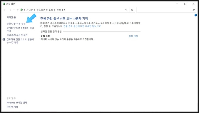 전원 옵셥 항목으로 진입하면 전원 단추 작동 설정 클릭!