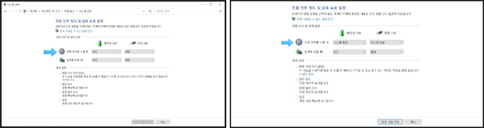 현재는 배터리 사용 / 전원 사용 바로 아래 절전, 절전으로 되어 있는데 모두 시스템종료 로 바꿔주면 끝!