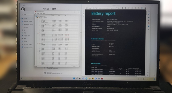 최소 43도! 게이밍노트북 치고는 양호한 편이며 배터리스웰링 증상으로 휘어진 팜레스트 역시 복원하고 다행히 기능