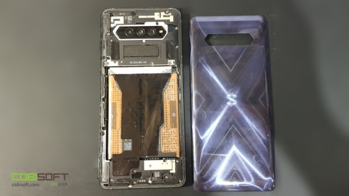 블랙샤크4 백커버 분리 후 바로 상하단 안테나, 카메라, 스피커 역활을 하는 보호 프레임 분리~ 샤오미폰 배터리는 작