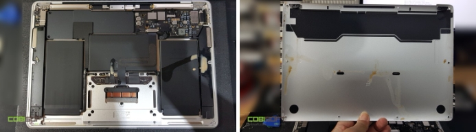 하게 뜯어보니... 생각보다 M1 맥북 에어 13인치 내부에 커피가 흥건했습니다.