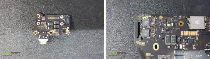 침수 맥북에어 모델이라 예상대로 메인보드 뒷면은 부식이 심한 상태며 그 외 전원버튼, 이어폰을 연결해주는 i/o 보드