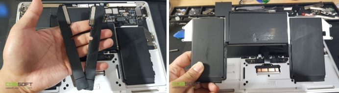 물에 민감한 전자기기 노트북 특성상 전원이 연결되어 있으면 쇼트 확률이 높기에 맥북수리 전 필수로 배터리 또는 전