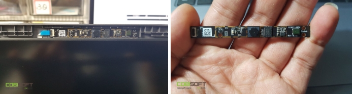 카메라 모듈은 노트북 액정 상단 중앙에 위치하며 이 부품을 제거하려면 액정 베젤을 분리하고 제거해야 되며 베젤은 생