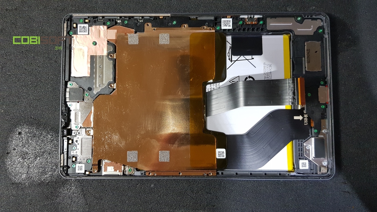 레노버 가성비 태블릿 P11 또는 샤오미신패드 태블릿과 달리 게이밍 라인이라 그런지 아주 큼지막한 베이퍼챔버 부품으로 보이는 구리판이 태블릿 절반을 덮고 있으며 문제의 충전단자는 사진상 우측 중앙에 위치합니다.