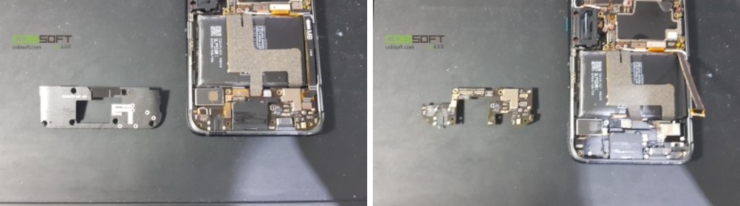로그폰 하단에는 안테나 프레임 및 USIM, 마이크, 기타 부품을 컨트롤하는 서브보드가 있으며 이 보드에서 액정관련 부품을 분리하거나 살짝 치우고 로그폰 액정교체 작업을 해주면 됩니다.